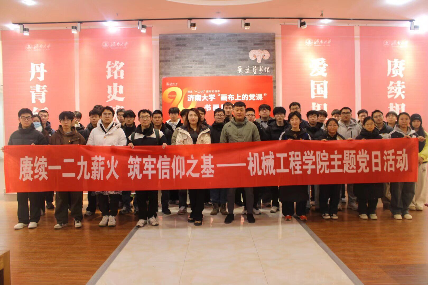 會(huì)后,學(xué)院組織全體新發(fā)展預(yù)備黨員前往舜道藝術(shù)館,參觀濟(jì)南大學(xué)紀(jì)念“一二·九”運(yùn)動(dòng)90周年“畫布上的黨課”書畫精品展。展覽中,一幅幅以紅色歷史、青年愛國(guó)奮斗為核心的書畫作品,將“一二?九”運(yùn)動(dòng)里學(xué)子們的熱血吶喊與新時(shí)代青年的使命擔(dān)當(dāng)鮮活串聯(lián),新發(fā)展預(yù)備黨員們駐足作品前,深刻感悟先輩們不畏強(qiáng)暴、奮起抗?fàn)幍膼蹏?guó)精神,黨員們紛紛表示要傳承紅色基因,以更加飽滿的熱情投身專業(yè)學(xué)習(xí)與科技創(chuàng)新。