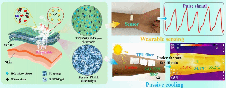 針對柔性傳感器穿戴舒適性不足與散熱性差的問題,本工作提出了一種具有人體熱管理功能的可呼吸離子式柔性觸覺傳感器。該傳感器是三明治結(jié)構(gòu),噴涂有二維片層結(jié)構(gòu)MXene的熱塑性聚氨酯彈性體(TPU)/SiO2納米纖維作為電極;裹覆陰陽離子的聚氨酯海綿作為電解質(zhì)。得益于海綿的微納孔隙結(jié)構(gòu)與超級電容原理,使得傳感器具有105.77 kPa?1的超高靈敏度與30ms的超快響應(yīng)時間;得益于SiO2與TPU納米纖維的高反射率,使得傳感器可以降低皮膚溫度3℃。同時,得益于TPU納米纖維的疏水性與孔隙結(jié)構(gòu),傳感器展示出良好的疏水性與透氣性,可以保證長時間穿戴舒適性與監(jiān)測精度。在與匹配電路形成傳感系統(tǒng)后,可以實時、精確監(jiān)測人體脈搏、肢體運(yùn)動等信號,為人體健康監(jiān)測與人體熱管理雙功能器件的開發(fā)提供了一種思路,為柔性電子的發(fā)展奠定良好基礎(chǔ)。該成果的刊發(fā)表明我院在柔性傳感領(lǐng)域的研究得到國際同行的認(rèn)可,推動了我校機(jī)械工程學(xué)科的發(fā)展。